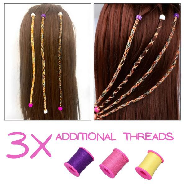 Obsah balenia: Sada obsahuje: 1x pomôcka na pletenie vrkočov, 12x sponky do vlasov, 3x niť (žltá, ružová a fialová niť), 2x príslušenstvo na uľahčenie používania